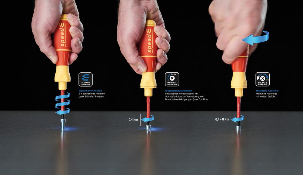 Vorteil: Schraubt mindestens 3-mal so schnell wie ein herkömmlicher Schraubendreher. Durch die elektrische Schraubfunktion und die SoftFinish®-Griffform reduziert der speedE® spürbar die Belastung.