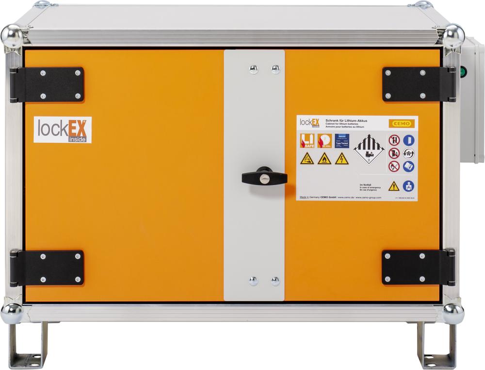 Sicherheit/Einsatz Schutz ohne Zeitlimit. Keine Kompromisse. Keine Zeitgrenze. Hält Batteriebränden vollständig stand. Kein Austritt von Flammen oder Funken. Ausführung • Laden und/oder Lagern mehrerer Lithium-Akkus im Schrank • Frühzeitige Alarmierung im Schadensfall • Alle relevanten Sicherheitsregeln zum Laden von Lithium-Batterien werden eingehalten • Ideal, um Akkus für den Ladevorgang von dem gelagerten Bestand abzuschirmen • Auch als Untertisch-Schrank unter der Werkbank einsetzbar • Geprüft nach VDMA-Standard • lockEX 2.0 ist nach dem neuesten VDMA Einheitsblatt geprüft, schützt effektiv über die marktüblichen 90 Minuten hinaus • Bauweise: mit nicht brennbaren, feuerwiderstandsfähigen Komponenten • Federbasierte lockEx-Türverriegelung: zur kontrollierten Druckentlastung bei Explosionen • Spezielle Brandschutzdichtungen: verhindern Flammenaustritt • Kaltrauchdichtes Verschlusssystem der Öffnungen • Transportierbar duch Stapelfüße • Türen: zweiflügelig, abschließbar, mit stabiler Verriegelung und Aufhängung • Lackierung: Tür in orange, ähnlich RAL 2004, Korpus in grau, ähnlich RAL 7035 Ausstattung Akku-Ladeschrank: • Wärmeabfuhr beim Laden durch Ventilator • Türkontaktschalter: Unterbrechung des Ladestroms beim Öffnen der Türen • Spezielle Brandschutzdichtungen verhindern Flammenaustritt • Ladestop im Stör- und Havariefall • Verschluss der Zu- und Abluftöffnung durch Thermoelemente Akku-Ladeschrank 8/5: • Stromversorgung durch 9-fach Steckdosenleiste (3500 W, 16 A) Ausstattung Premium – Konzipiert für anspruchsvolle Anwendungen Vollständige Integration in bestehende Sicherheitsinfrastrukturen durch Anbindung an zentrale Brandmeldeanlagen (BMA). Wie Basic, aber mit strombetriebenem Rauchmelder. Zusätzlich: Stromlosschaltung auch bei Rauchdetektion, akustischer Warnton, potentialfreier Ausgang für Aufschaltung auf Brandmeldeanlage an Schrankaußenseite, 12 V-Anschlussmöglichkeit von zum Beispiel Zubehör wie Kombialarmgeber (optisch und akustisch) Hinweis: CEMO lockEX ist eine federbasierte Mechanik in der Türverriegelung, die effektiv den Explosionsdruck sich entzündender Gase im Inneren des Schrankes bewältigt. Diese NO-BANG-Technologie gewährleistet den Erhalt der Schutzwirkung.