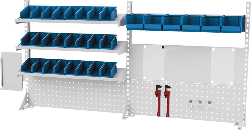 Aufbauten mit Tragsäulen geeignet ab Plattenstärke 40 mm 3 Tragsäulen 950 mm 2 Lochwände 1000 x 302 mm 3 Fachböden 1000 x 220 mm 1 Schiene mit 6 Sichtlagerkästen, Größe 3 (Lieferung ohne Kästen links) 1 Dokumenthalter