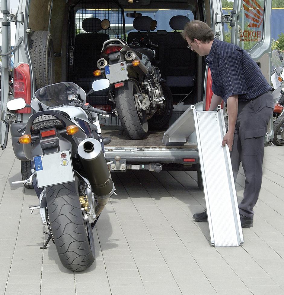 Die faltbare Verladeschiene ist platzsparend verstau-, transportierbar.